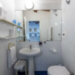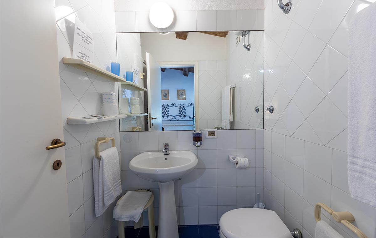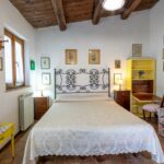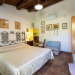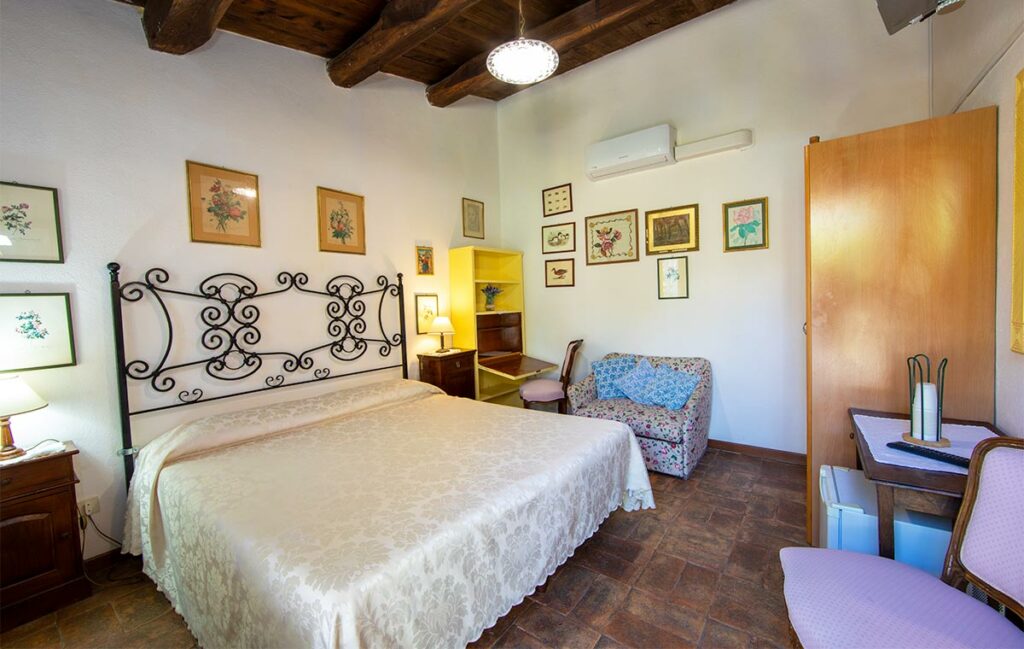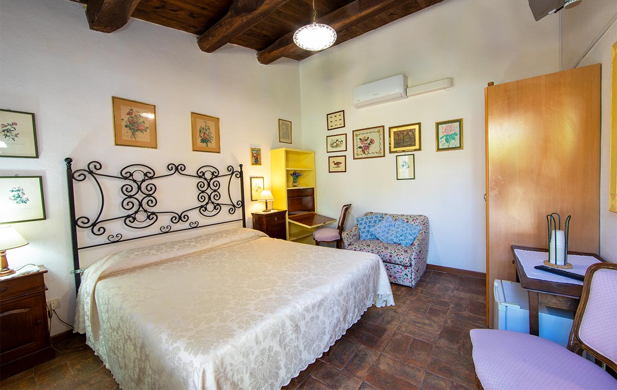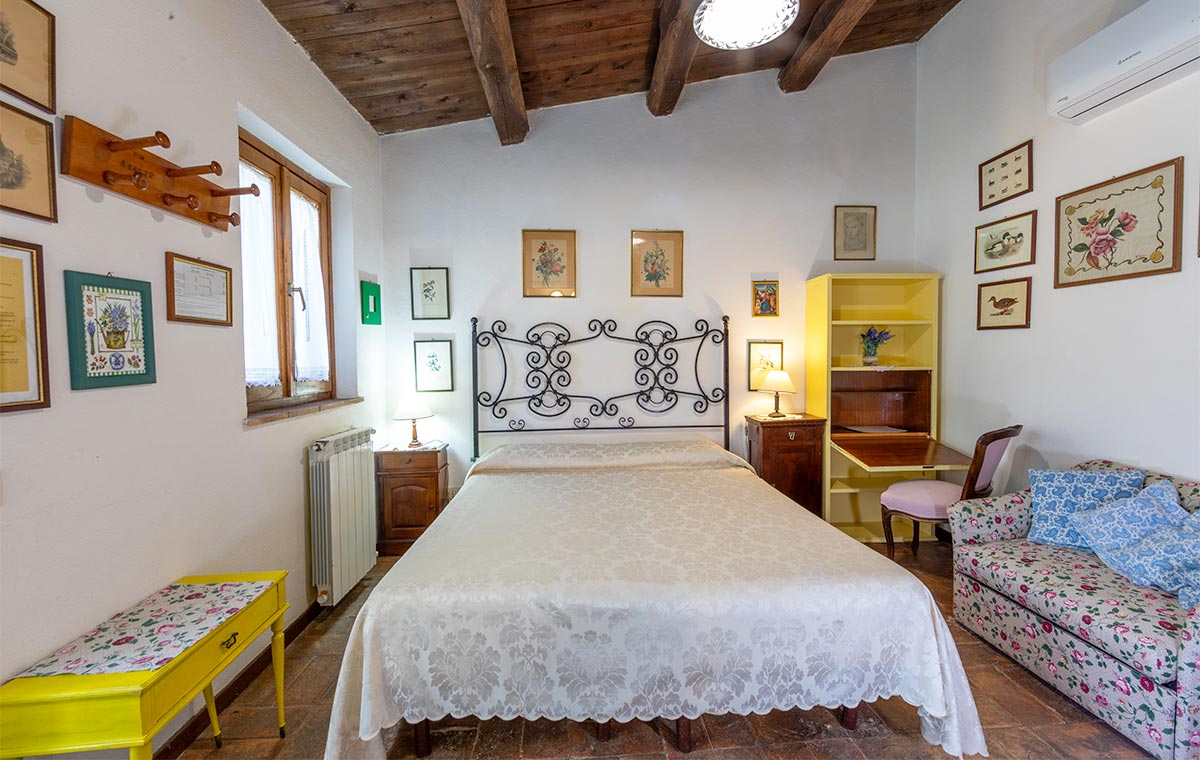 Camera doppia con lo spazio per aggiungere un letto singolo, bagno, pareti e toni della tappezzeria sul giallo, cotto antico e travi di castagno.