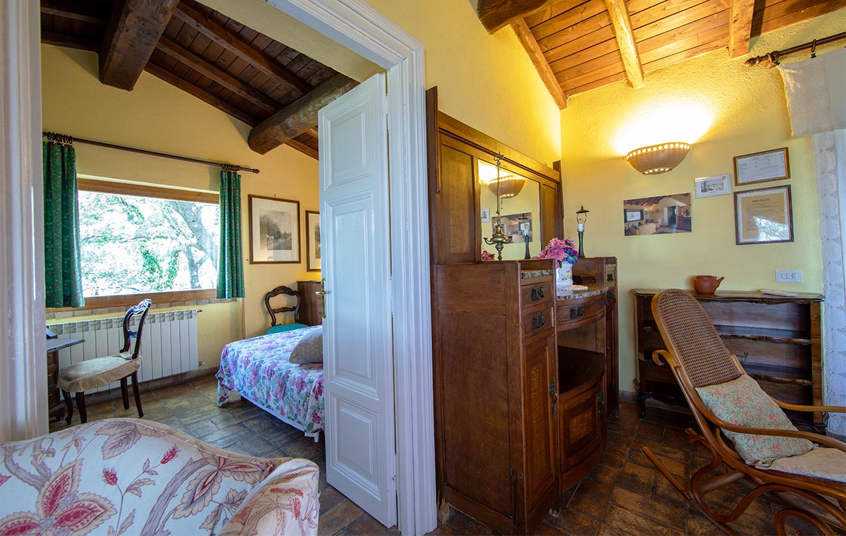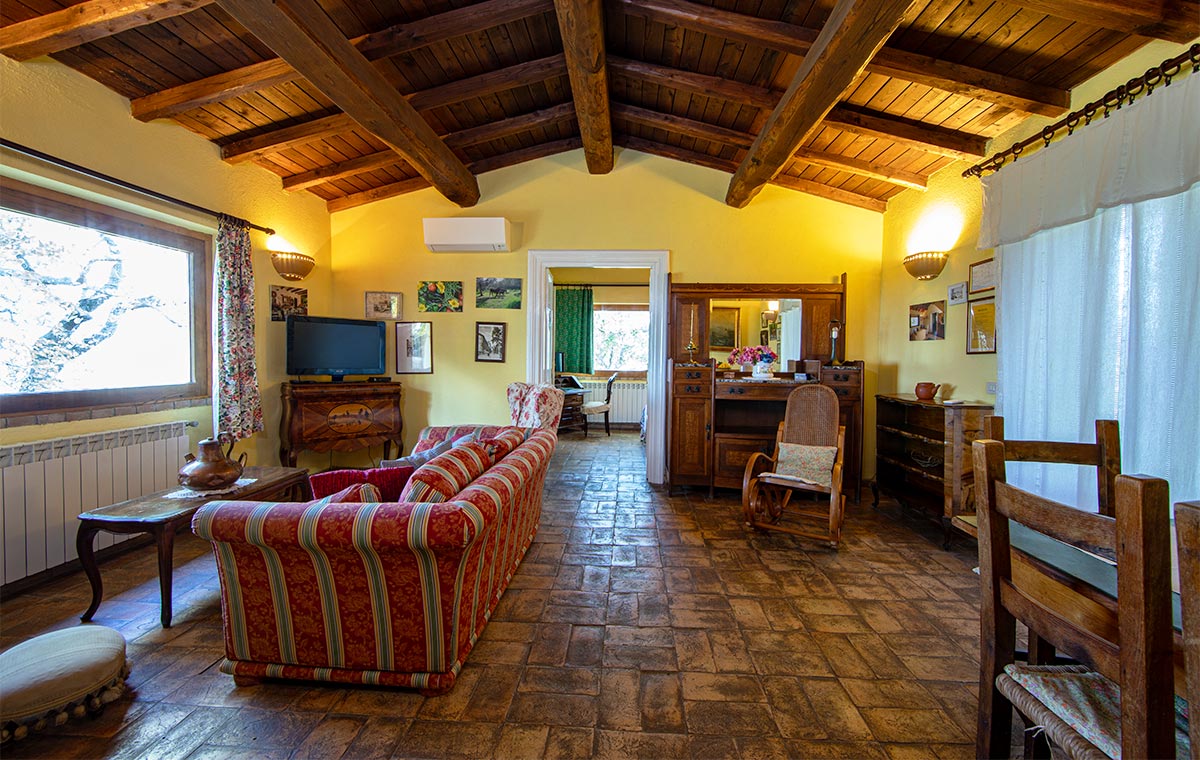 Travi in castagno, cotto antico ed ampie vetrate con vista mozzafiato sulla valle del fiume Farfa.